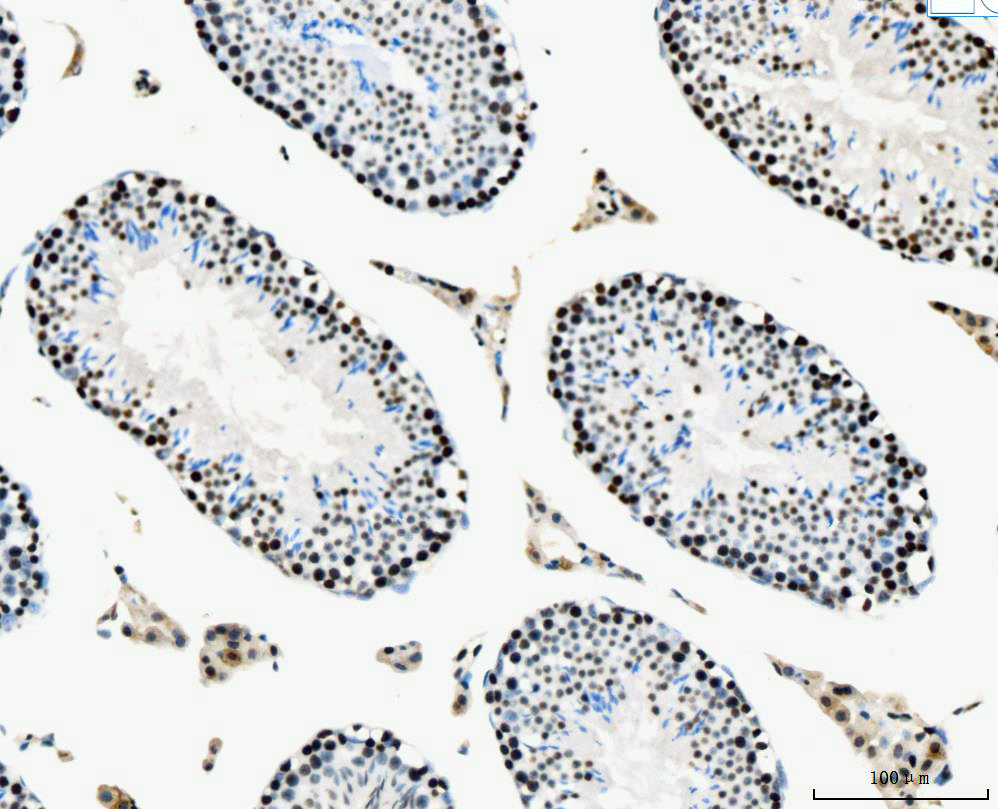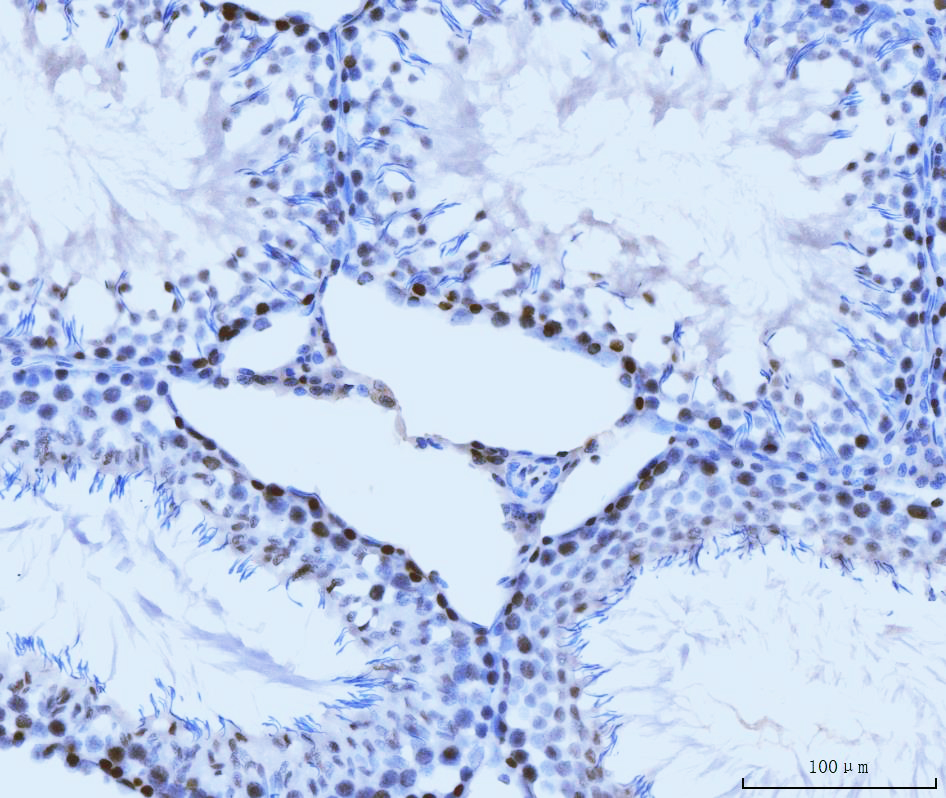 MCM6 was detected in a paraffin-embedded section of rat testis tissue. Biotinylated goat anti-mouse IgG was used as secondary antibody. The tissue section was incubated with mouse anti-MCM6 Antibody (M02755-2) at a dilution of 1:200 and developed using Strepavidin-Biotin-Complex (SABC) (Catalog # SA1021) with DAB (Catalog # AR1027) as the chromogen.