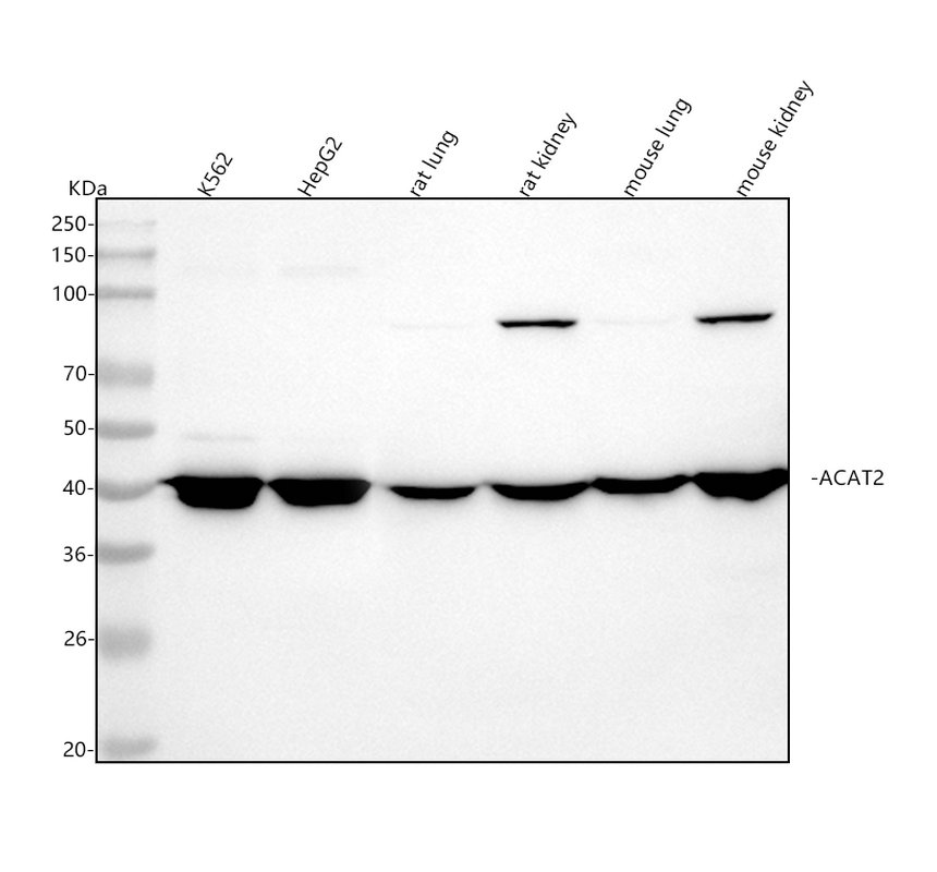 Western blot analysis of extracts (35ug) from 9 different cell lines by using anti-ACAT2 monoclonal antibody.