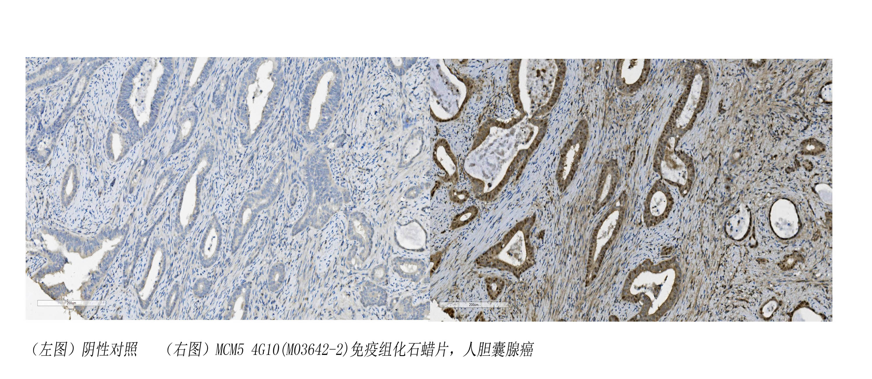 MCM5 was detected in a paraffin-embedded section of human gallbladder adenocarcinoma tissue. Biotinylated goat anti-mouse IgG was used as secondary antibody. The tissue section was incubated with mouse anti-MCM5 Antibody (M03642-2) at a dilution of 1:200 and developed using Strepavidin-Biotin-Complex (SABC) (Catalog # SA1021) with DAB (Catalog # AR1027) as the chromogen.