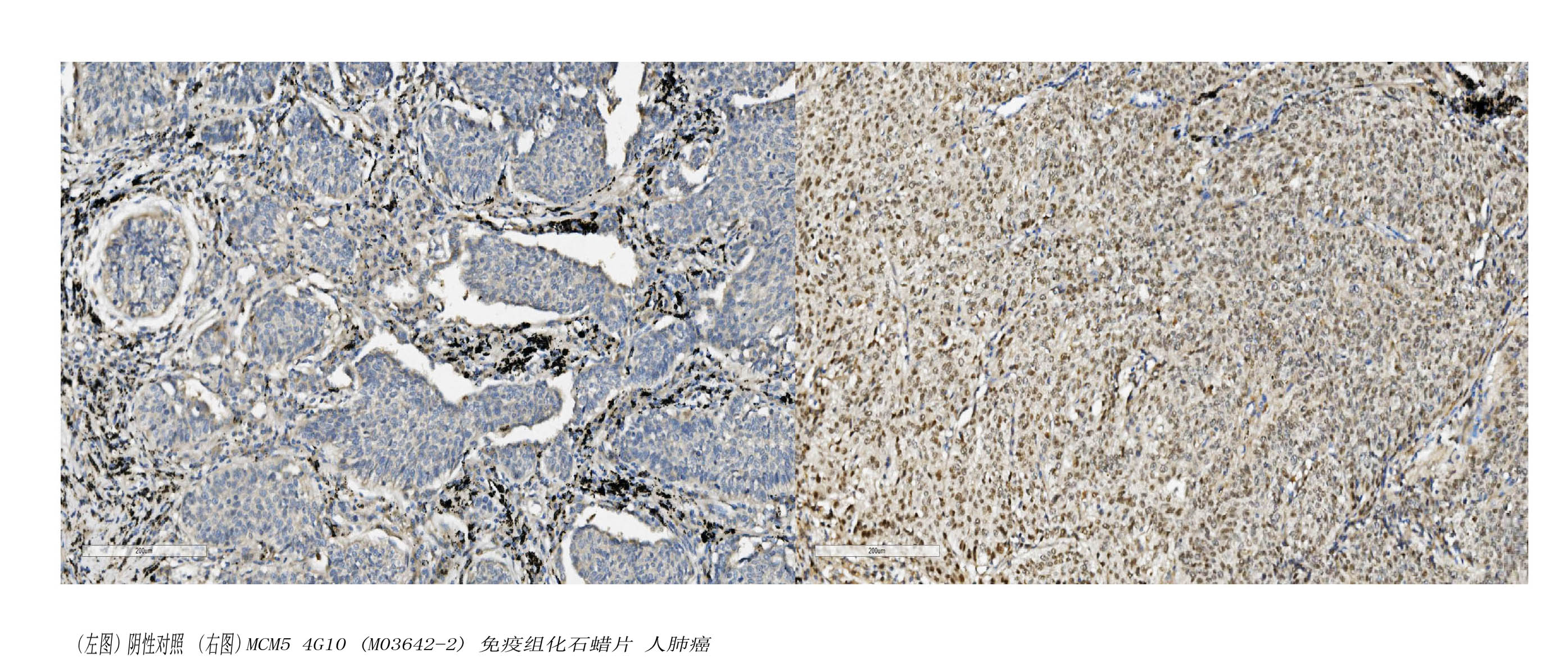 MCM5 was detected in a paraffin-embedded section of human lung cancer tissue. Biotinylated goat anti-mouse IgG was used as secondary antibody. The tissue section was incubated with mouse anti-MCM5 Antibody (M03642-2) at a dilution of 1:200 and developed using Strepavidin-Biotin-Complex (SABC) (Catalog # SA1021) with DAB (Catalog # AR1027) as the chromogen.