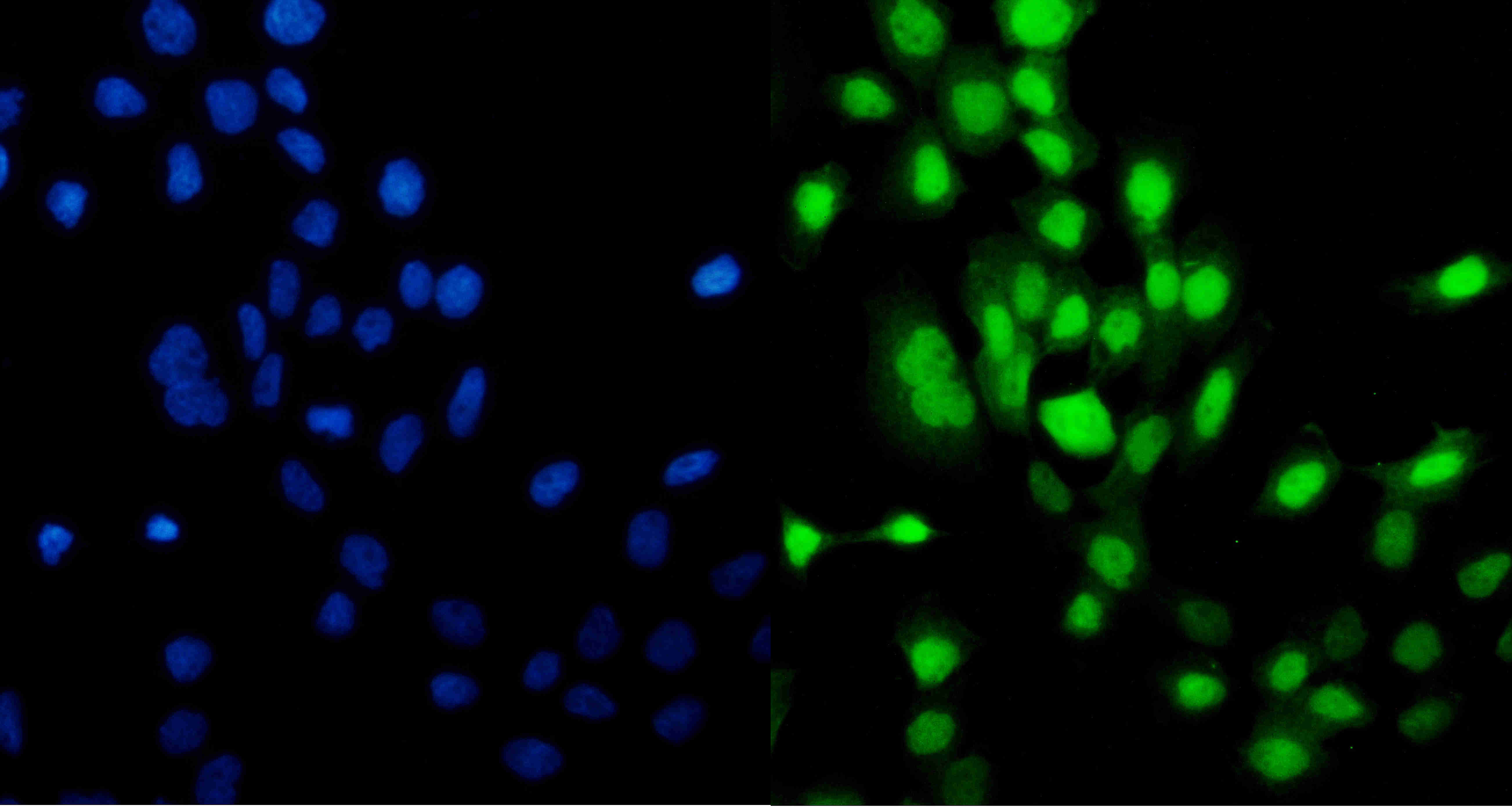 MCM5 was detected in an immunocytochemical section of A431 cells. The section was incubated with mouse anti-MCM5 Antibody (M03642-2) at a dilution of 1:100. Fluoro488-conjugated Anti-mouse IgG Secondary Antibody (green)(Catalog#BA1126) was used as secondary antibody. The section was counterstained with DAPI (Catalog # AR1176) (Blue).