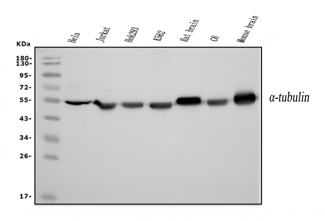 Western blot analysis of Alpha Tubulin/TUBA1A using anti-Alpha Tubulin/TUBA1A antibody (M03989-3). The sample well of each lane was loaded with 30 ug of sample under reducing conditions.