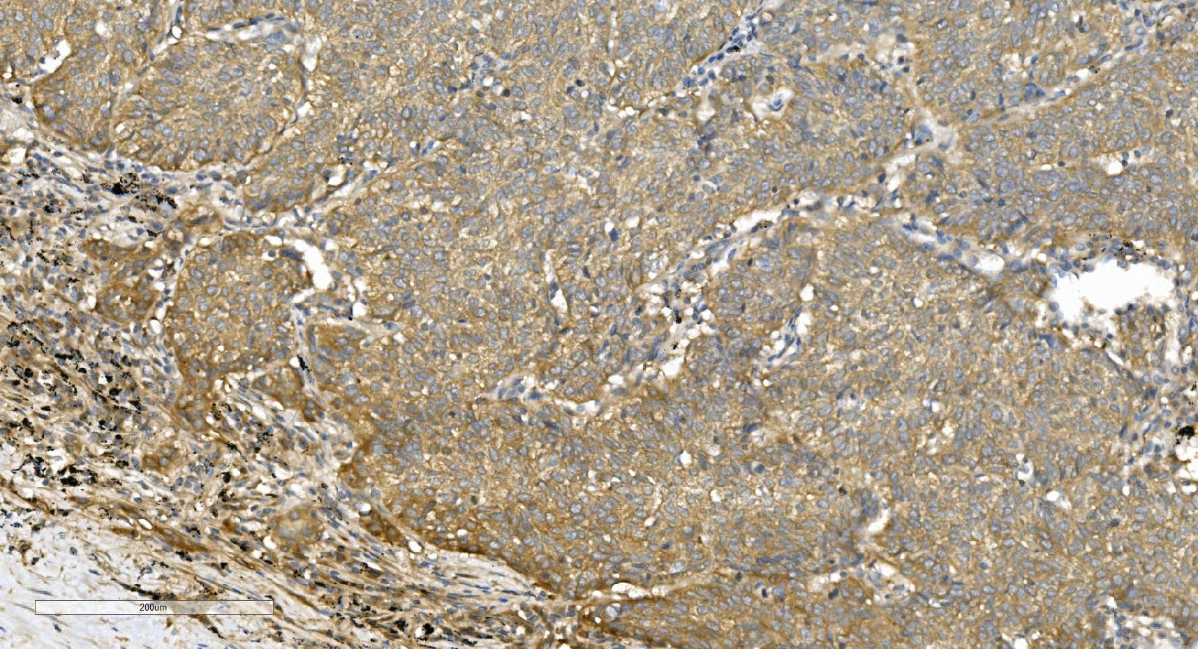 Alpha Tubulin/TUBA1A was detected in a paraffin-embedded section of human lung cancer tissue. Biotinylated goat anti-mouse IgG was used as secondary antibody. The tissue section was incubated with mouse anti-Alpha Tubulin/TUBA1A Antibody (M03989-3) at a dilution of 1:200 and developed using Strepavidin-Biotin-Complex (SABC) (Catalog # SA1021) with DAB (Catalog # AR1027) as the chromogen.