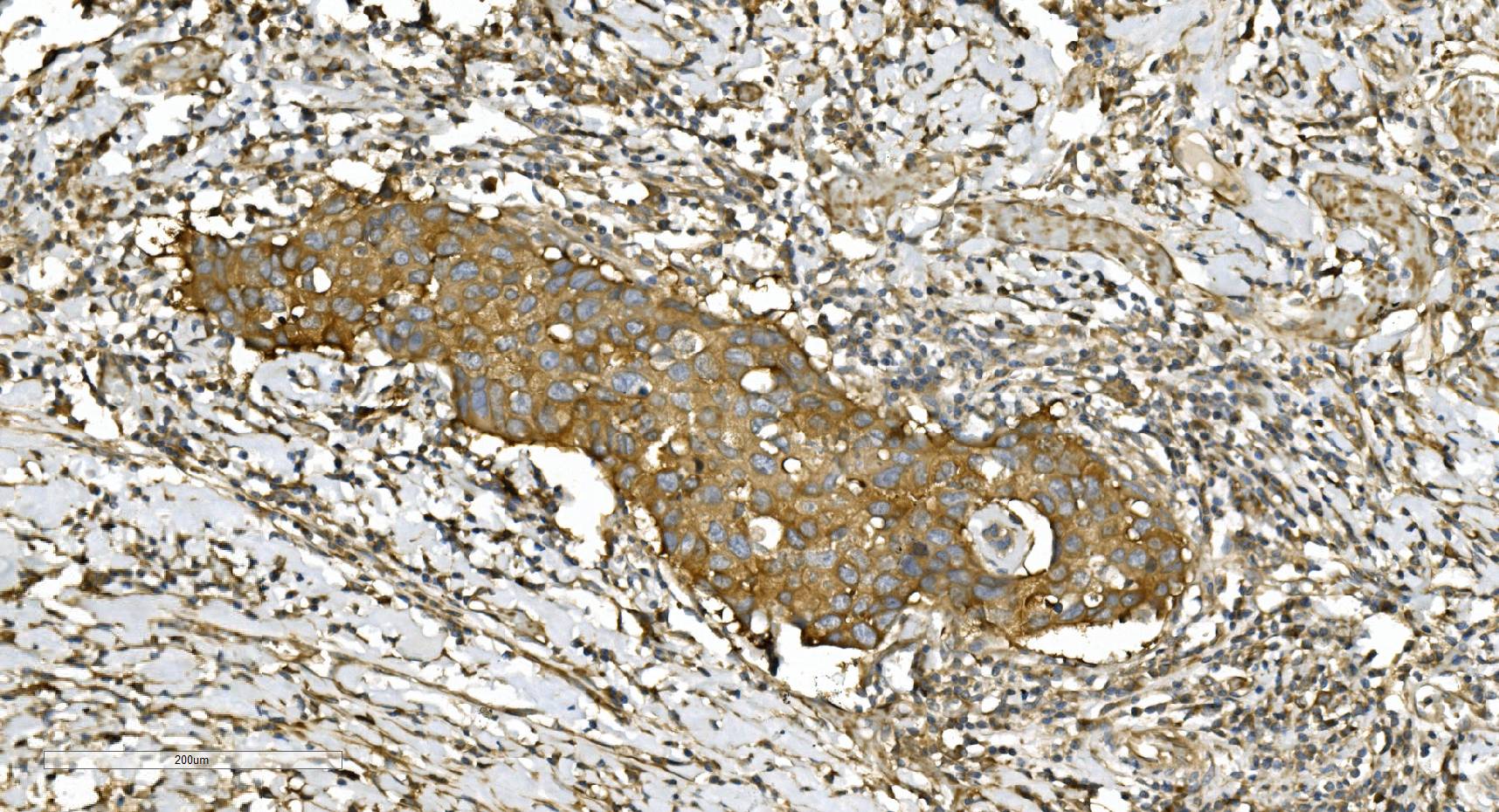 Alpha Tubulin/TUBA1A was detected in a paraffin-embedded section of human pancreatic cancer tissue. Biotinylated goat anti-mouse IgG was used as secondary antibody. The tissue section was incubated with mouse anti-Alpha Tubulin/TUBA1A Antibody (M03989-3) at a dilution of 1:200 and developed using Strepavidin-Biotin-Complex (SABC) (Catalog # SA1021) with DAB (Catalog # AR1027) as the chromogen.