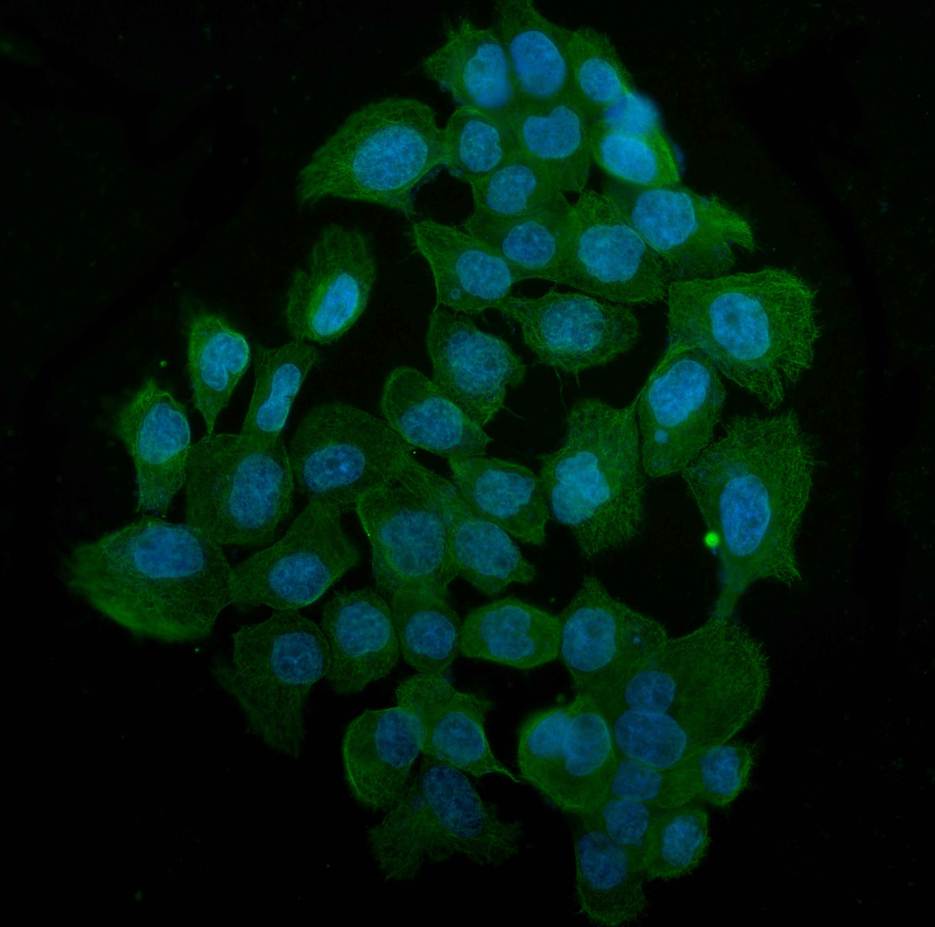 Alpha Tubulin/TUBA1A was detected in an immunocytochemical section of A431 cells. The section was incubated with mouse anti-Alpha Tubulin/TUBA1A Antibody (M03989-3) at a dilution of 1:100. Fluoro488-conjugated Anti-mouse IgG Secondary Antibody (green)(Catalog#BA1126) was used as secondary antibody. The section was counterstained with DAPI (Catalog # AR1176) (Blue).