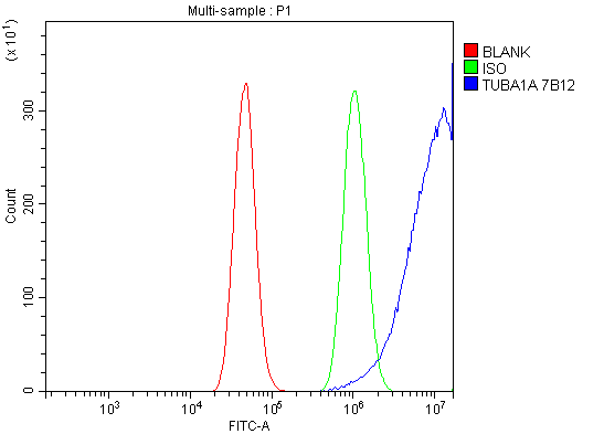 Overlay histogram showing A431 cells stained with M03989-3 (Blue line). To facilitate intracellular staining, cells were fixed with 4% paraformaldehyde and permeabilized with permeabilization buffer. The cells were blocked with 10% normal goat serum. And then incubated with mouse anti-Alpha Tubulin/TUBA1A Antibody (M03989-3) at 1:100 dilution for 30 min at 20°C. Fluoro488 conjugated goat anti-mouse IgG (BA1126) was used as secondary antibody at 1:100 dilution for 30 minutes at 20°C. Isotype control antibody (Green line) was mouse IgG at 1:100 dilution used under the same conditions. Unlabelled sample without incubation with primary antibody and secondary antibody (Red line) was used as a blank control.