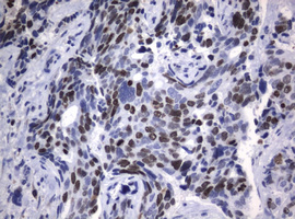 Immunohistochemical staining of paraffin-embedded Carcinoma of Human lung tissue using anti-MKI67 rat monoclonal antibody. (MA00254; heat-induced epitope retrieval by 10mM citric buffer, pH6.0, 120°C for 3min)