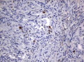 Immunohistochemical staining of paraffin-embedded Adenocarcinoma of Human endometrium tissue using anti-MKI67 rat monoclonal antibody. (MA00254; heat-induced epitope retrieval by 10mM citric buffer, pH6.0, 120°C for 3min)