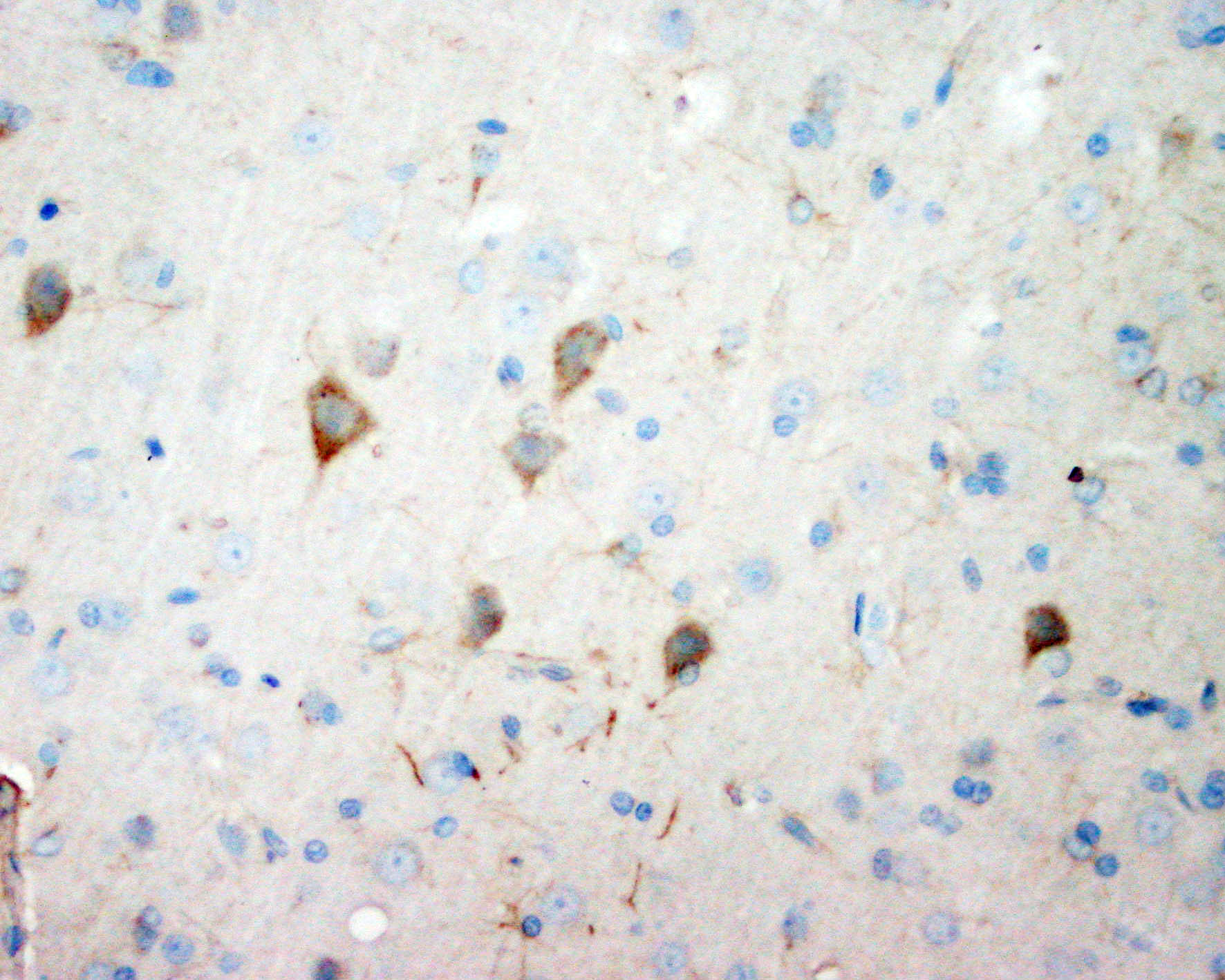 NSE/ENO2 was detected in a paraffin-embedded section of rat brain tissue. Biotinylated goat anti-rabbit IgG was used as secondary antibody. The tissue section was incubated with rabbit anti-NSE/ENO2 Antibody (PA1061) at a dilution of 1:200 and developed using Strepavidin-Biotin-Complex (SABC) (Catalog # SA1022) with DAB (Catalog # AR1027) as the chromogen.