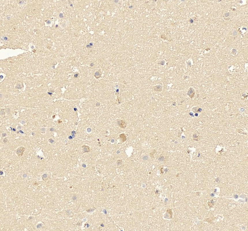 NSE/ENO2 was detected in a paraffin-embedded section of human brain tissue. The tissue section was incubated with rabbit anti-NSE/ENO2 Antibody (PA1061) at a dilution of 1:200 and developed using HRP Conjugated Rabbit IgG Super Vision Assay Kit (Catalog # SV0002) with DAB (Catalog # AR1027) as the chromogen.