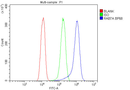 Overlay histogram showing A431 cells stained with PB0927 (Blue line). To facilitate intracellular staining, cells were fixed with 4% paraformaldehyde and permeabilized with permeabilization buffer. The cells were blocked with 10% normal goat serum. And then incubated with rabbit anti-RAB7A Antibody (PB0927) at 1:100 dilution for 30 min at 20°C. Fluoro488 conjugated goat anti-rabbit IgG (BA1127) was used as secondary antibody at 1:100 dilution for 30 minutes at 20°C. Isotype control antibody (Green line) was rabbit IgG at 1:100 dilution used under the same conditions. Unlabelled sample without incubation with primary antibody and secondary antibody (Red line) was used as a blank control.