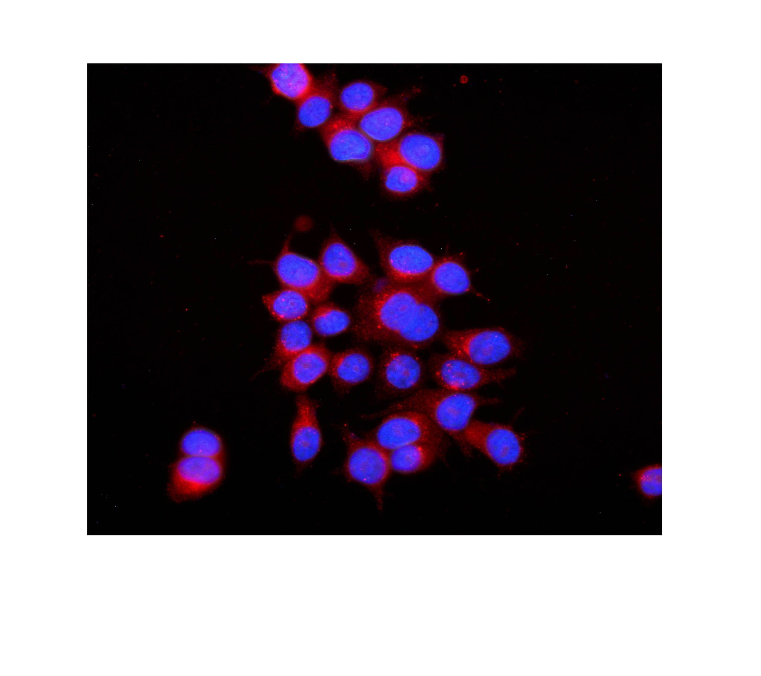 RAB7A was detected in an immunocytochemical section of MCF-7 cells. The section was incubated with rabbit anti-RAB7A Antibody (PB0927) at a dilution of 1:100. Fluoro594-conjugated Anti-rabbit IgG Secondary Antibody (red)(Catalog#BA1142) was used as secondary antibody. The section was counterstained with DAPI (Catalog # AR1176) (Blue).