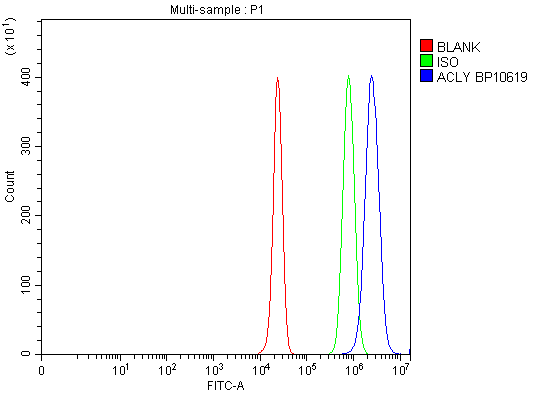 Overlay histogram showing HepG2 cells stained with PB10024 (Blue line). To facilitate intracellular staining, cells were fixed with 4% paraformaldehyde and permeabilized with permeabilization buffer. The cells were blocked with 10% normal goat serum. And then incubated with rabbit anti-ACLY Antibody (PB10024) at 1:100 dilution for 30 min at 20°C. Fluoro488 conjugated goat anti-rabbit IgG (BA1127) was used as secondary antibody at 1:100 dilution for 30 minutes at 20°C. Isotype control antibody (Green line) was rabbit IgG at 1:100 dilution used under the same conditions. Unlabelled sample without incubation with primary antibody and secondary antibody (Red line) was used as a blank control.