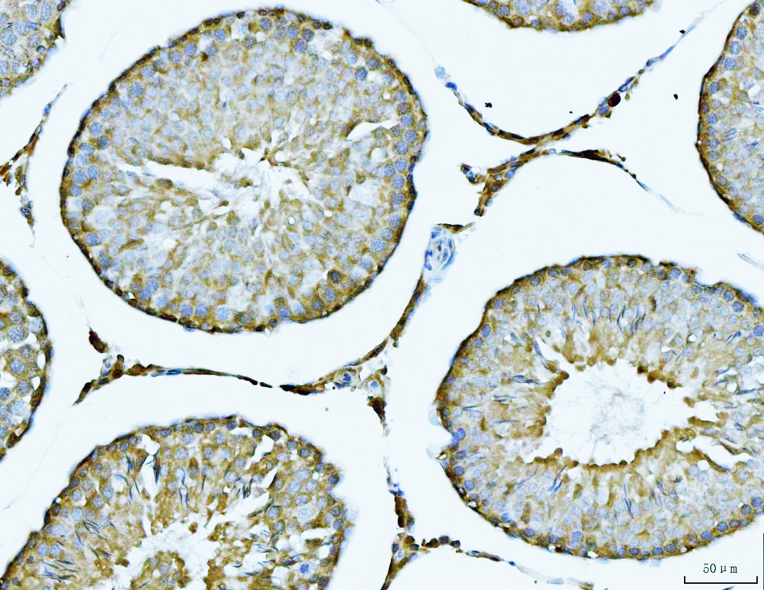 ACLY was detected in a paraffin-embedded section of mouse testis tissue. Biotinylated goat anti-rabbit IgG was used as secondary antibody. The tissue section was incubated with rabbit anti-ACLY Antibody (PB10024) at a dilution of 1:200 and developed using Strepavidin-Biotin-Complex (SABC) (Catalog # SA1022) with DAB (Catalog # AR1027) as the chromogen.