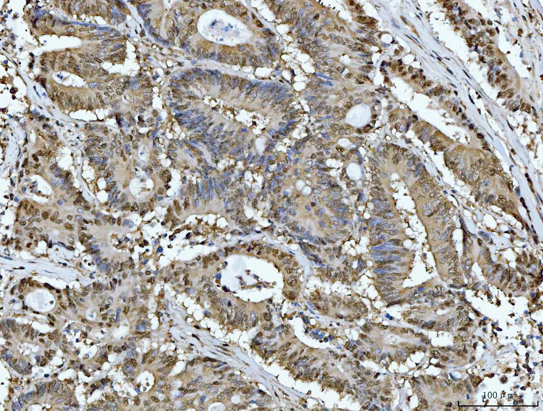 ACLY was detected in a paraffin-embedded section of human colonic adenocarcinoma tissue. Biotinylated goat anti-rabbit IgG was used as secondary antibody. The tissue section was incubated with rabbit anti-ACLY Antibody (PB10024) at a dilution of 1:200 and developed using Strepavidin-Biotin-Complex (SABC) (Catalog # SA1022) with DAB (Catalog # AR1027) as the chromogen.