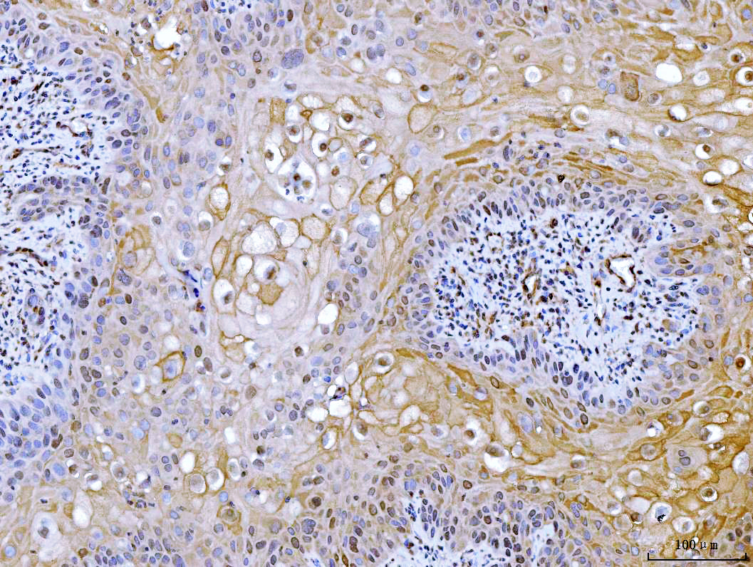 ACLY was detected in a paraffin-embedded section of human Laryngeal squamous cell carcinoma tissue. Biotinylated goat anti-rabbit IgG was used as secondary antibody. The tissue section was incubated with rabbit anti-ACLY Antibody (PB10024) at a dilution of 1:200 and developed using Strepavidin-Biotin-Complex (SABC) (Catalog # SA1022) with DAB (Catalog # AR1027) as the chromogen.