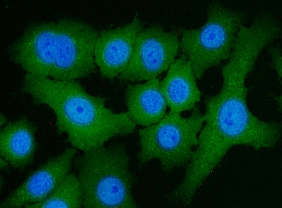 ACLY was detected in an immunocytochemical section of A549 cells. The section was incubated with rabbit anti-ACLY Antibody (PB10024) at a dilution of 1:100. Fluoro488 Conjugated Goat Anti-Rabbit IgG (Green) (Catalog # BA1127) was used as secondary antibody. The section was counterstained with DAPI (Catalog # AR1176) (Blue).