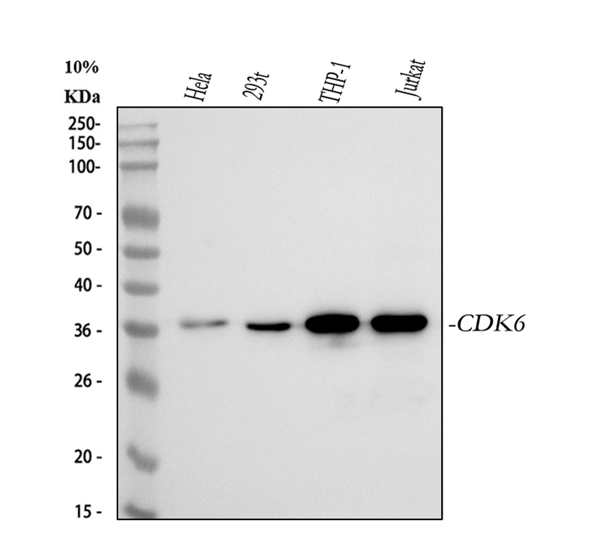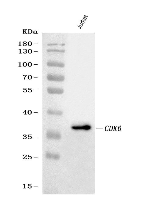 Western blot analysis of CDK6 using anti-CDK6 antibody (PB1047). The sample well of each lane was loaded with 30 ug of sample under reducing conditions.