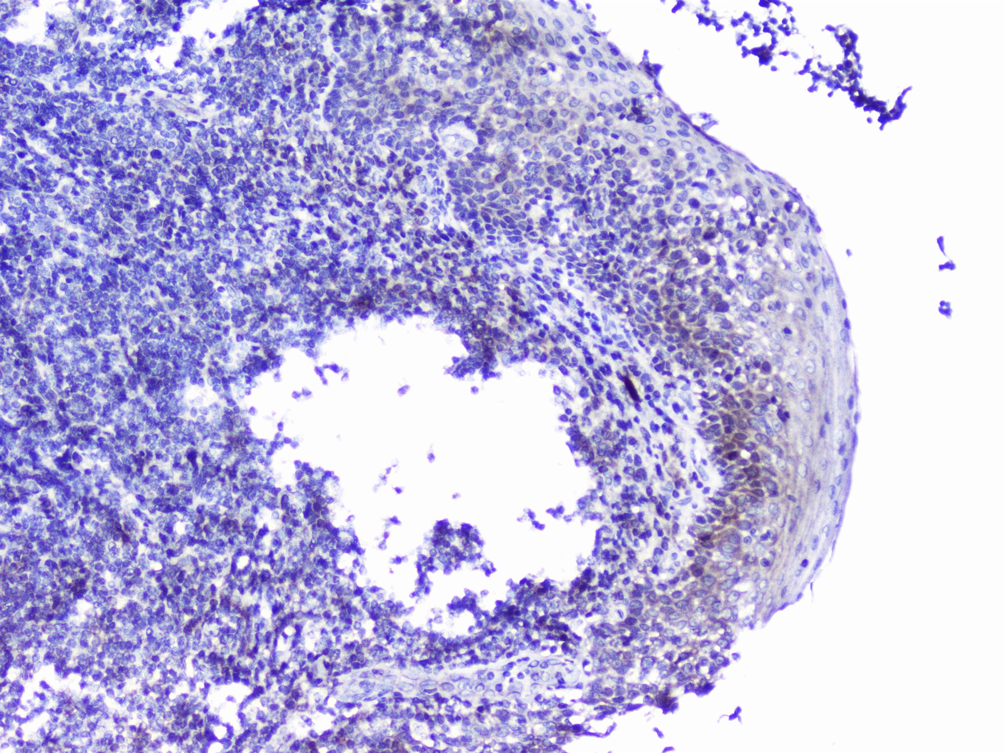CDK6 was detected in a paraffin-embedded section of human tonsil tissue. Biotinylated goat anti-rabbit IgG was used as secondary antibody. The tissue section was incubated with rabbit anti-CDK6 Antibody (PB1047) at a dilution of 1:200 and developed using Strepavidin-Biotin-Complex (SABC) (Catalog # SA1022) with DAB (Catalog # AR1027) as the chromogen.