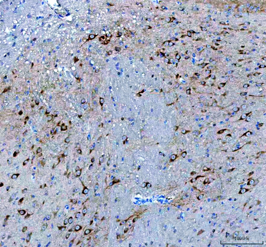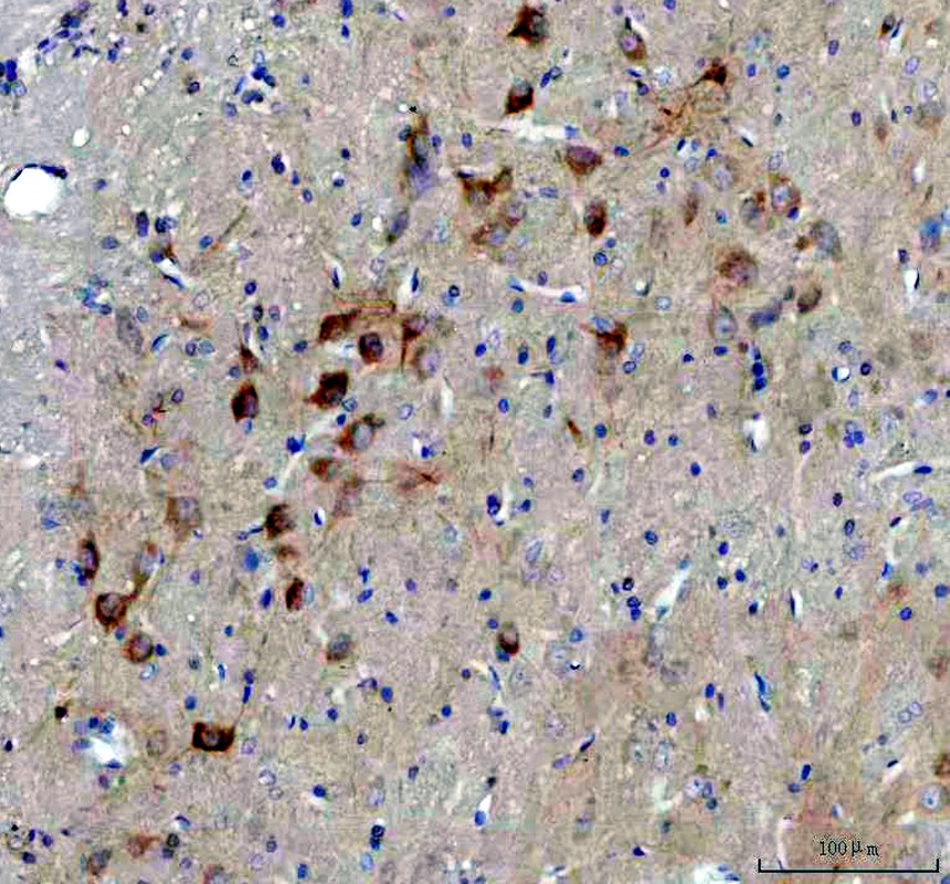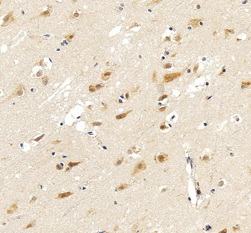 BDNF was detected in a paraffin-embedded section of human brain tissue. The tissue section was incubated with rabbit anti-BDNF Antibody (PB9075) at a dilution of 1:200 and developed using HRP Conjugated Rabbit IgG Super Vision Assay Kit (Catalog # SV0002) with DAB (Catalog # AR1027) as the chromogen.