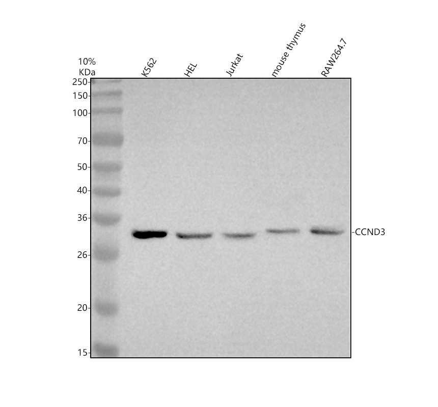 Western blot analysis of Cyclin D3/CCND3 using anti-Cyclin D3/CCND3 antibody (PB9103). The sample well of each lane was loaded with 30 ug of sample under reducing conditions.