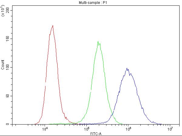 Overlay histogram showing THP-1 cells stained with PB9104 (Blue line). To facilitate intracellular staining, cells were fixed with 4% paraformaldehyde and permeabilized with permeabilization buffer. The cells were blocked with 10% normal goat serum. And then incubated with rabbit anti-Cyclin B1/CCNB1 Antibody (PB9104) at 1:100 dilution for 30 min at 20°C. Fluoro488 conjugated goat anti-rabbit IgG (BA1127) was used as secondary antibody at 1:100 dilution for 30 minutes at 20°C. Isotype control antibody (Green line) was rabbit IgG at 1:100 dilution used under the same conditions. Unlabelled sample without incubation with primary antibody and secondary antibody (Red line) was used as a blank control.