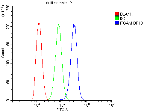 Overlay histogram showing THP-1 cells stained with PB9140 (Blue line). The cells were fixed with 4% paraformaldehyde and blocked with 10% normal goat serum. And then incubated with rabbit anti-CD11B/Integrin Alpha M/ITGAM Antibody (PB9140) at 1:100 dilution for 30 min at 20°C. Fluoro488 conjugated goat anti-rabbit IgG (BA1127) was used as secondary antibody at 1:100 dilution for 30 minutes at 20°C. Isotype control antibody (Green line) was rabbit IgG at 1:100 dilution used under the same conditions. Unlabelled sample without incubation with primary antibody and secondary antibody (Red line) was used as a blank control.