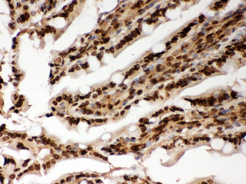 Lamin A/C was detected in a paraffin-embedded section of mouse intestine tissue. Biotinylated goat anti-rabbit IgG was used as secondary antibody. The tissue section was incubated with rabbit anti-Lamin A/C Antibody (PB9280) at a dilution of 1:200 and developed using Strepavidin-Biotin-Complex (SABC) (Catalog # SA1022) with DAB (Catalog # AR1027) as the chromogen.
