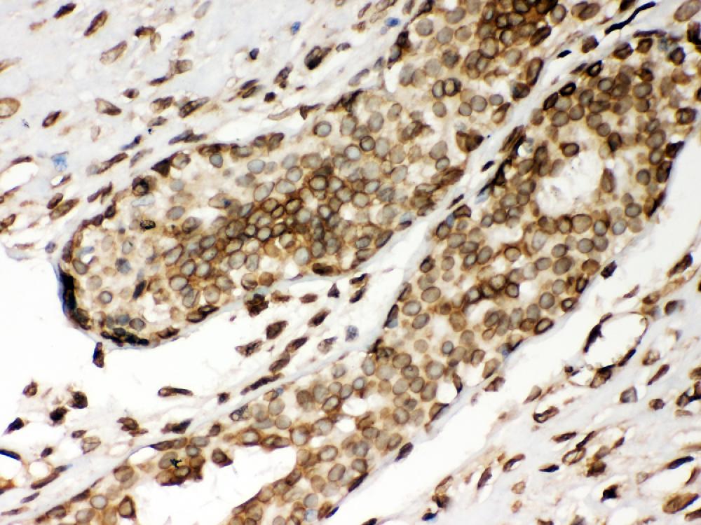 Lamin A/C was detected in a paraffin-embedded section of human mammary cancer tissue. Biotinylated goat anti-rabbit IgG was used as secondary antibody. The tissue section was incubated with rabbit anti-Lamin A/C Antibody (PB9280) at a dilution of 1:200 and developed using Strepavidin-Biotin-Complex (SABC) (Catalog # SA1022) with DAB (Catalog # AR1027) as the chromogen.