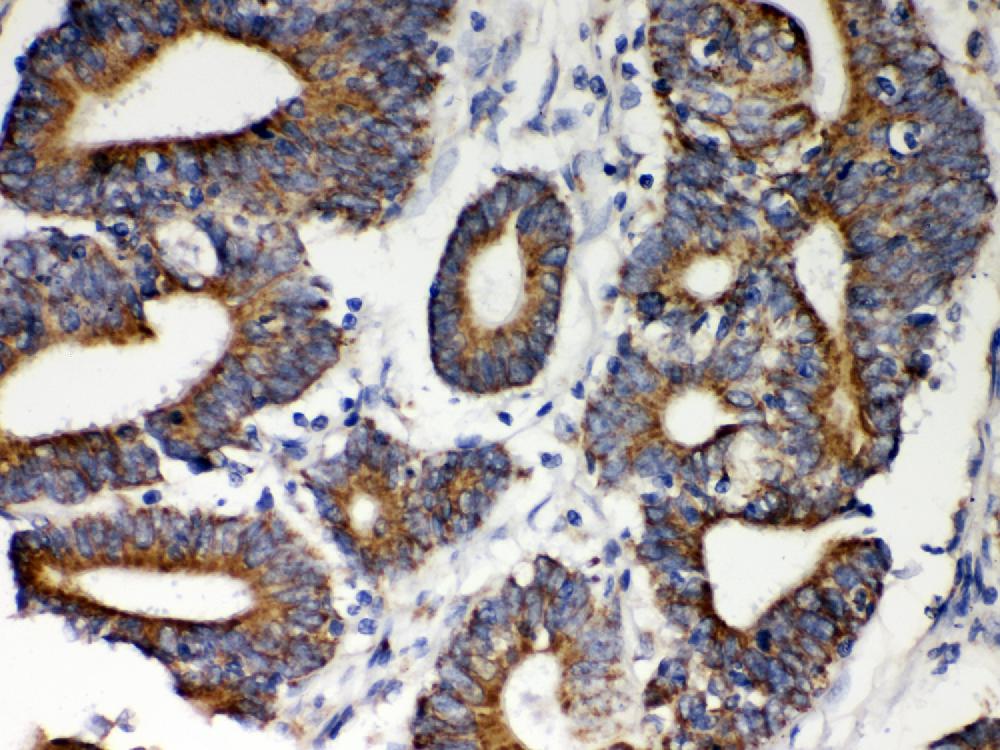 HSP60/HSPD1 was detected in a paraffin-embedded section of human intestinal cancer tissue. Biotinylated goat anti-rabbit IgG was used as secondary antibody. The tissue section was incubated with rabbit anti-HSP60/HSPD1 Antibody (PB9337) at a dilution of 1:200 and developed using Strepavidin-Biotin-Complex (SABC) (Catalog # SA1022) with DAB (Catalog # AR1027) as the chromogen.