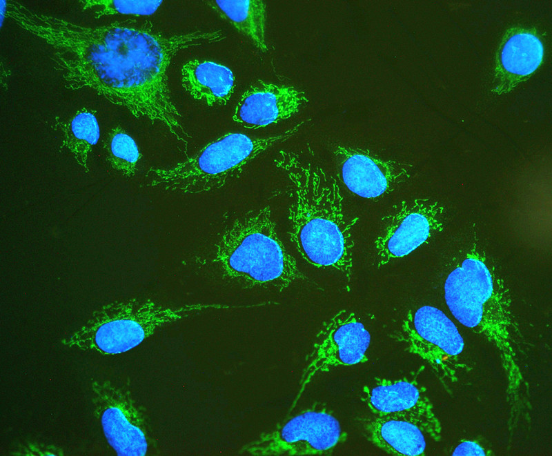 Hsp60 was detected in immunocytochemical section of U20S cell. Enzyme antigen retrieval was performed using IHC enzyme antigen retrieval reagent (AR0022) for 15 mins. The cells were blocked with 10% goat serum. And then incubated with 2μg/mL rabbit anti-Hsp60 Antibody (PB9337) overnight at 4°C. Fluoro488 Conjugated Goat Anti-Rabbit IgG (BA1127) was used as secondary antibody at 1:100 dilution and incubated for 30 minutes at 37°C. The section was counterstained with DAPI. Visualize using a fluorescence microscope and filter sets appropriate for the label used.