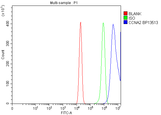 Overlay histogram showing U2OS cells stained with PB9424 (Blue line). To facilitate intracellular staining, cells were fixed with 4% paraformaldehyde and permeabilized with permeabilization buffer. The cells were blocked with 10% normal goat serum. And then incubated with rabbit anti-Cyclin A2/CCNA2 Antibody (PB9424) at 1:100 dilution for 30 min at 20°C. Fluoro488 conjugated goat anti-rabbit IgG (BA1127) was used as secondary antibody at 1:100 dilution for 30 minutes at 20°C. Isotype control antibody (Green line) was rabbit IgG at 1:100 dilution used under the same conditions. Unlabelled sample without incubation with primary antibody and secondary antibody (Red line) was used as a blank control.