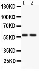 After electrophoresis, proteins were transferred to a membrane. Then the membrane was incubated with rabbit anti-ATG14 antigen affinity purified polyclonal antibody (PB9481) at a dilution of 1:1000 and probed with a goat anti-rabbit IgG-HRP secondary antibody (Catalog # BA1054). The signal is developed using ECL Plus Western Blotting Substrate (Catalog # AR1197). A specific band was detected for ATG14 at approximately 59 kDa. The expected band size for ATG14 is at 55 kDa.