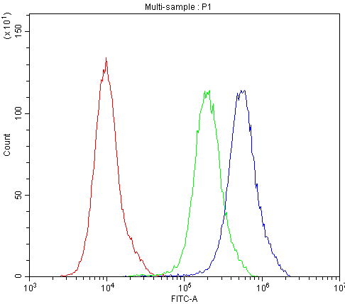 Overlay histogram showing A431 cells stained with PB9481 (Blue line). To facilitate intracellular staining, cells were fixed with 4% paraformaldehyde and permeabilized with permeabilization buffer. The cells were blocked with 10% normal goat serum. And then incubated with rabbit anti-ATG14 Antibody (PB9481) at 1:100 dilution for 30 min at 20°C. Fluoro488 conjugated goat anti-rabbit IgG (BA1127) was used as secondary antibody at 1:100 dilution for 30 minutes at 20°C. Isotype control antibody (Green line) was rabbit IgG at 1:100 dilution used under the same conditions. Unlabelled sample without incubation with primary antibody and secondary antibody (Red line) was used as a blank control.