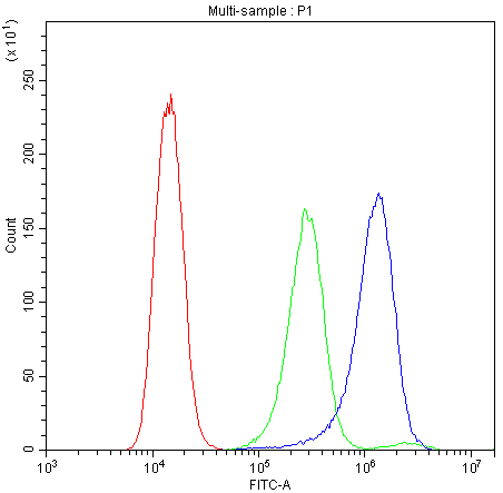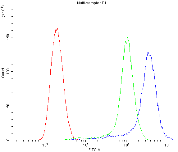 Overlay histogram showing SiHa cells stained with PB9481 (Blue line). To facilitate intracellular staining, cells were fixed with 4% paraformaldehyde and permeabilized with permeabilization buffer. The cells were blocked with 10% normal goat serum. And then incubated with rabbit anti-ATG14 Antibody (PB9481) at 1:100 dilution for 30 min at 20°C. Fluoro488 conjugated goat anti-rabbit IgG (BA1127) was used as secondary antibody at 1:100 dilution for 30 minutes at 20°C. Isotype control antibody (Green line) was rabbit IgG at 1:100 dilution used under the same conditions. Unlabelled sample without incubation with primary antibody and secondary antibody (Red line) was used as a blank control.