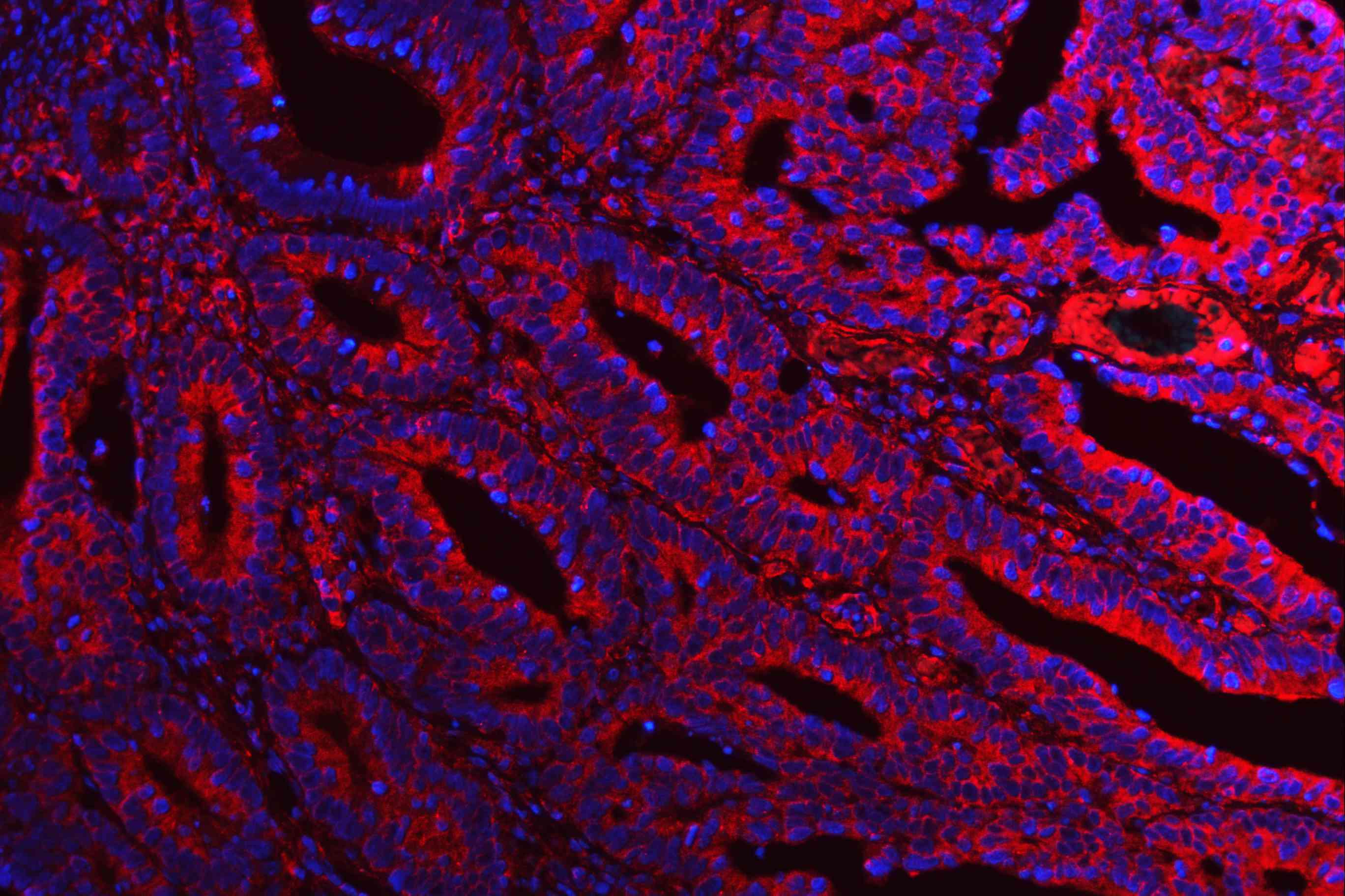 ATG14 was detected in a paraffin-embedded section of human colon cancer tissue. Cy3-conjugated Anti-rabbit IgG Secondary Antibody (red)(Catalog#BA1032) was used as secondary antibody. The section was counterstained with DAPI (Catalog # AR1176) (Blue).