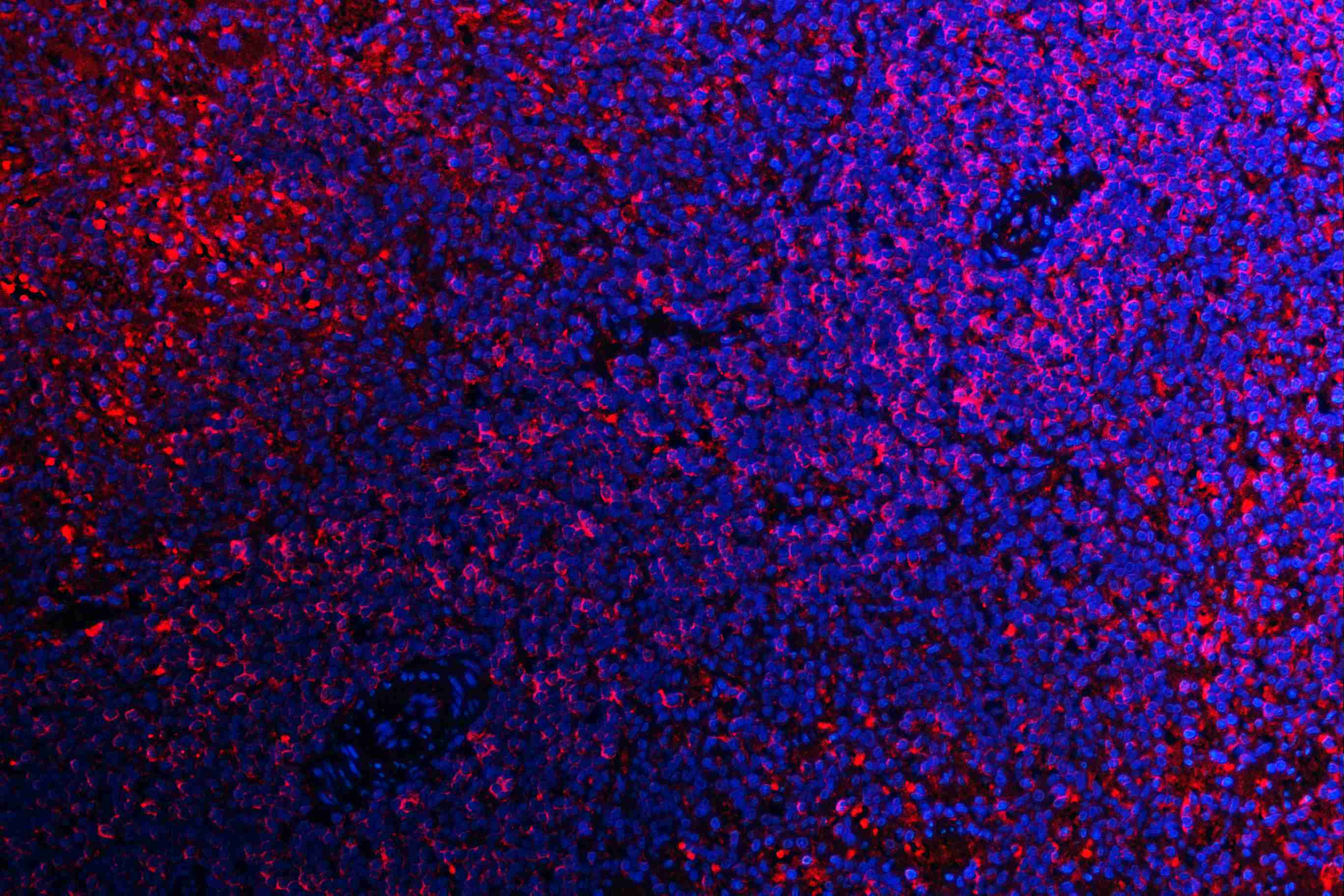 ATG14 was detected in a paraffin-embedded section of rat spleen tissue. Cy3-conjugated Anti-rabbit IgG Secondary Antibody (red)(Catalog#BA1032) was used as secondary antibody. The section was counterstained with DAPI (Catalog # AR1176) (Blue).