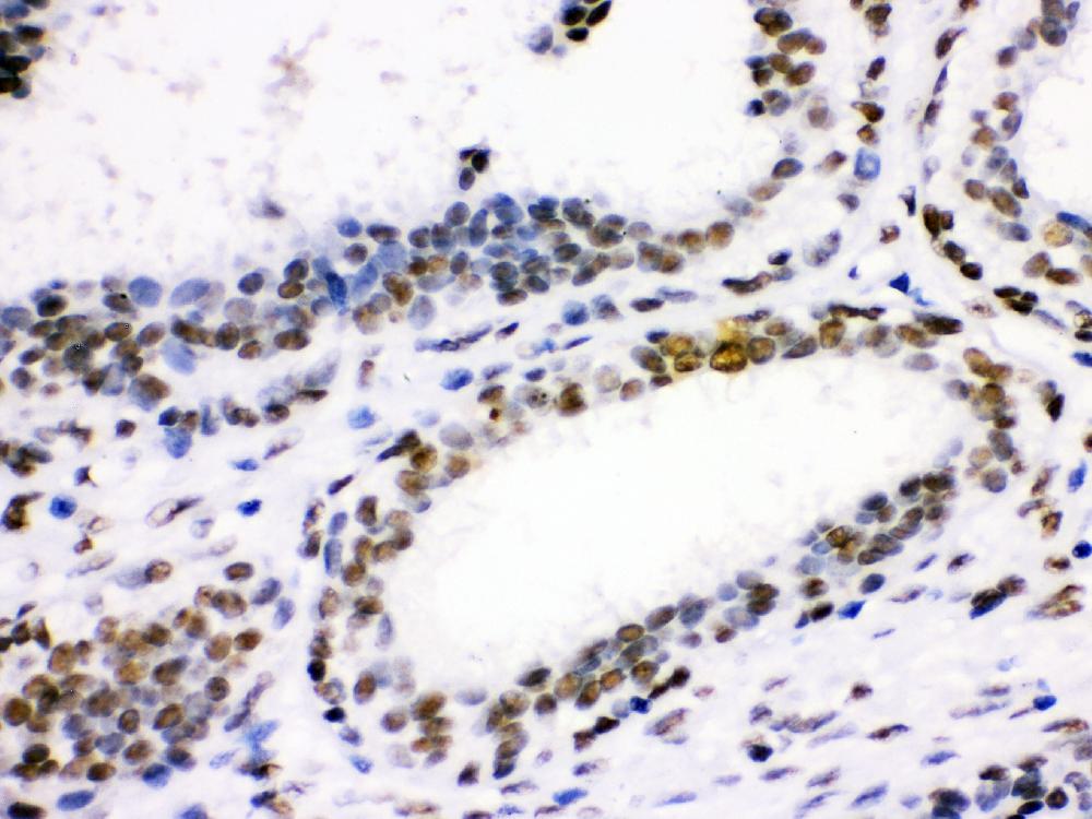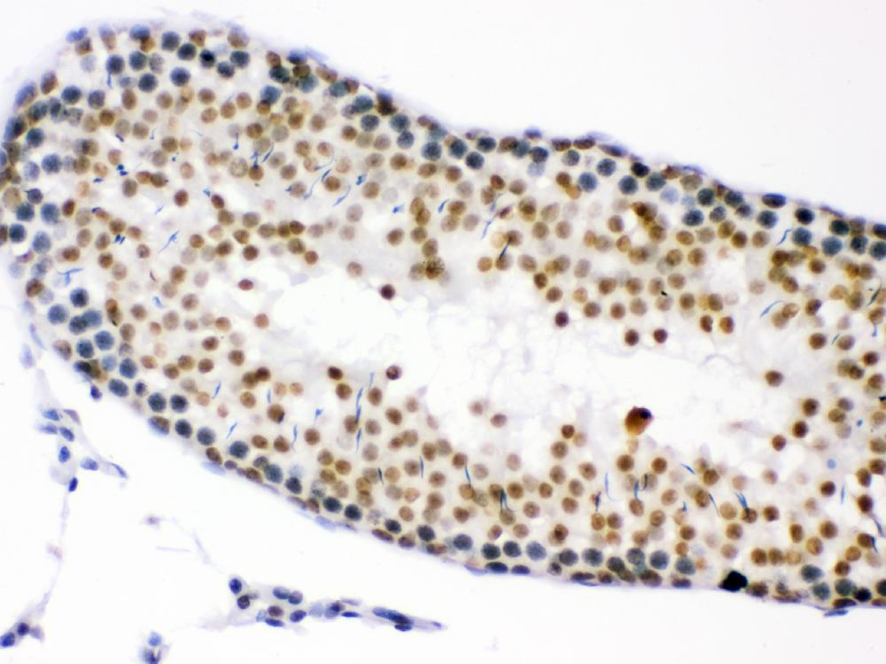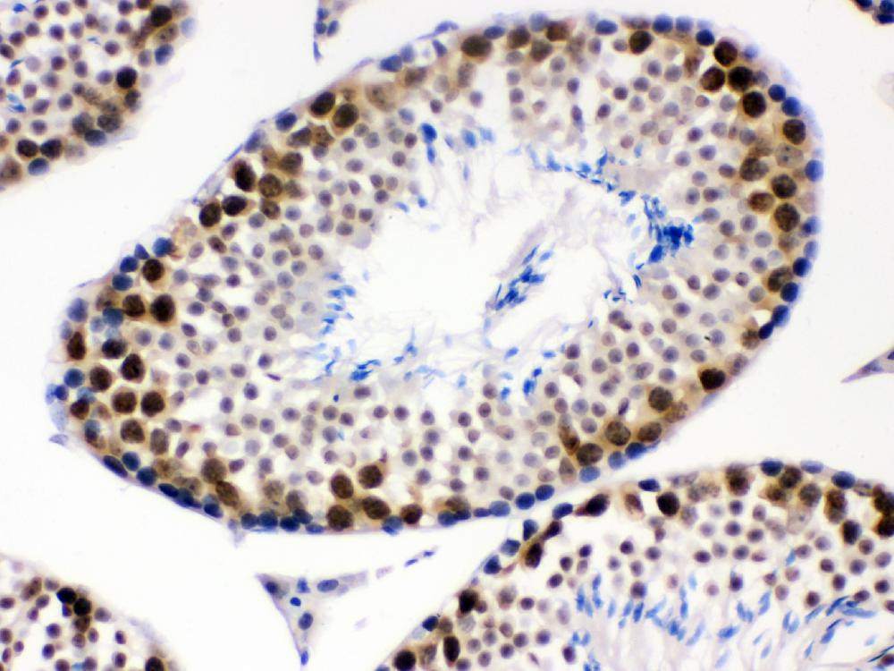 CDK1 was detected in a paraffin-embedded section of rat testis tissue. Biotinylated goat anti-rabbit IgG was used as secondary antibody. The tissue section was incubated with rabbit anti-CDK1 Antibody (PB9533) at a dilution of 1:200 and developed using Strepavidin-Biotin-Complex (SABC) (Catalog # SA1022) with DAB (Catalog # AR1027) as the chromogen.