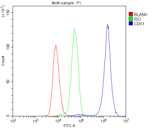 Overlay histogram showing U937 cells stained with PB9533 (Blue line). To facilitate intracellular staining, cells were fixed with 4% paraformaldehyde and permeabilized with permeabilization buffer. The cells were blocked with 10% normal goat serum. And then incubated with rabbit anti-CDK1 Antibody (PB9533) at 1:100 dilution for 30 min at 20°C. Fluoro488 conjugated goat anti-rabbit IgG (BA1127) was used as secondary antibody at 1:100 dilution for 30 minutes at 20°C. Isotype control antibody (Green line) was rabbit IgG at 1:100 dilution used under the same conditions. Unlabelled sample without incubation with primary antibody and secondary antibody (Red line) was used as a blank control.