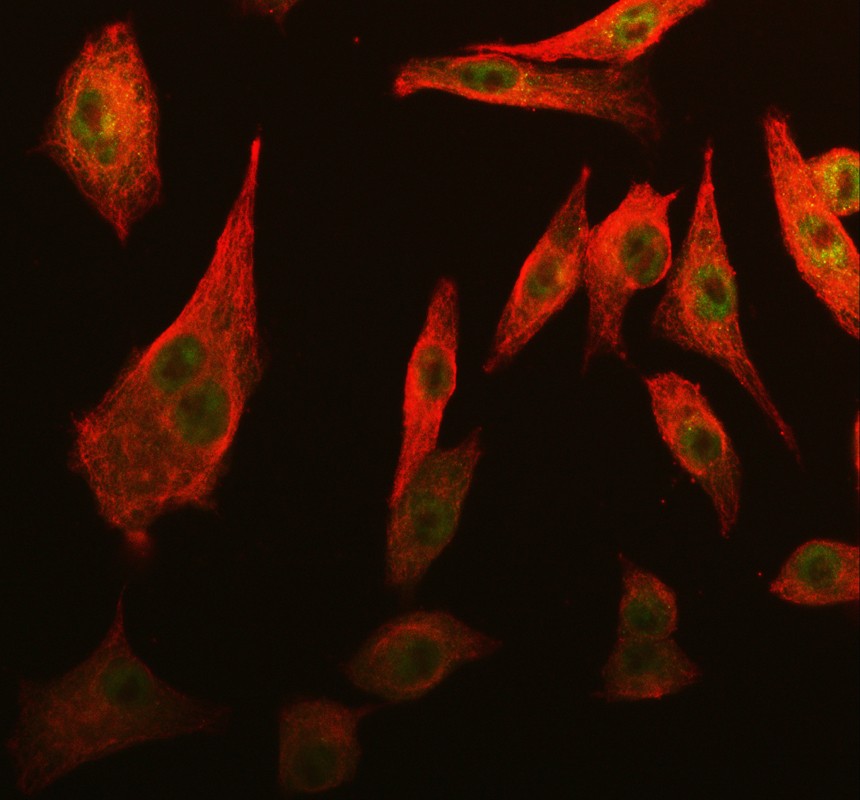 CDK2 was detected in an immunocytochemical section of A549 cells. The section was incubated with rabbit anti-CDK2 Antibody (PB9534) at a dilution of 1:100. Fluoro488-conjugated Anti-rabbit IgG Secondary Antibody (green)(Catalog#BA1127) and Fluoro594-conjugated Anti-mouse IgG Secondary Antibody (red)(Catalog#BA1141) were used as secondary antibody.