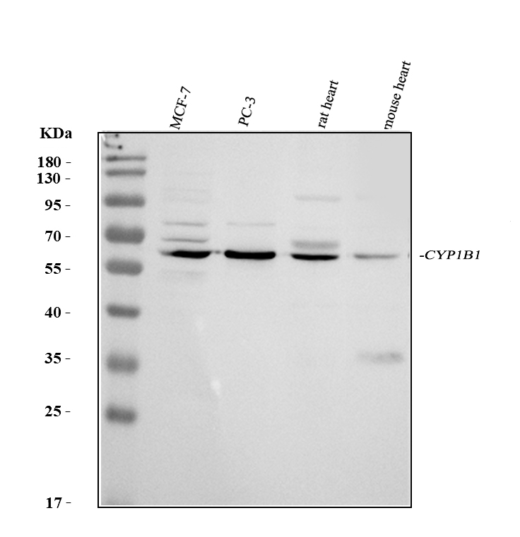 Western blot analysis of CYP1B1 using anti-CYP1B1 antibody (PB9546). The sample well of each lane was loaded with 30 ug of sample under reducing conditions.