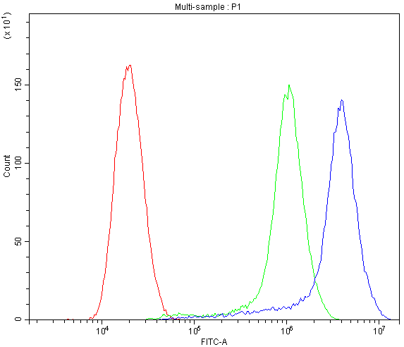 Overlay histogram showing SiHa cells stained with PB9546 (Blue line). To facilitate intracellular staining, cells were fixed with 4% paraformaldehyde and permeabilized with permeabilization buffer. The cells were blocked with 10% normal goat serum. And then incubated with rabbit anti-CYP1B1 Antibody (PB9546) at 1:100 dilution for 30 min at 20°C. Fluoro488 conjugated goat anti-rabbit IgG (BA1127) was used as secondary antibody at 1:100 dilution for 30 minutes at 20°C. Isotype control antibody (Green line) was rabbit IgG at 1:100 dilution used under the same conditions. Unlabelled sample without incubation with primary antibody and secondary antibody (Red line) was used as a blank control.