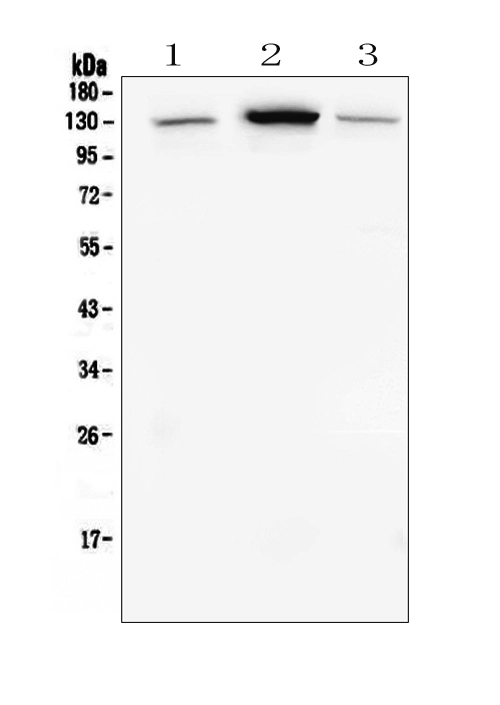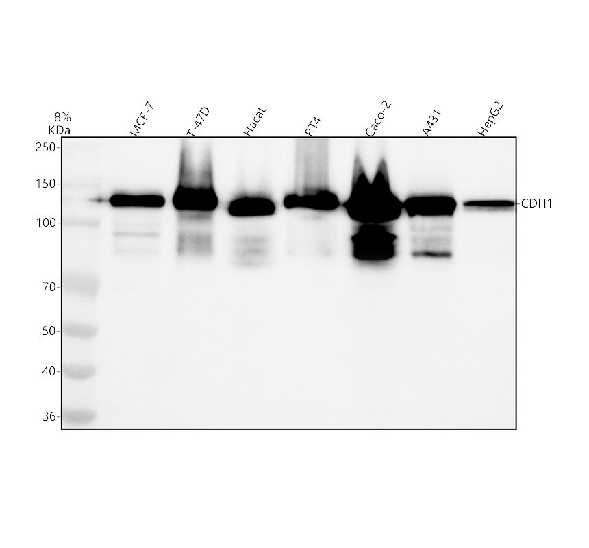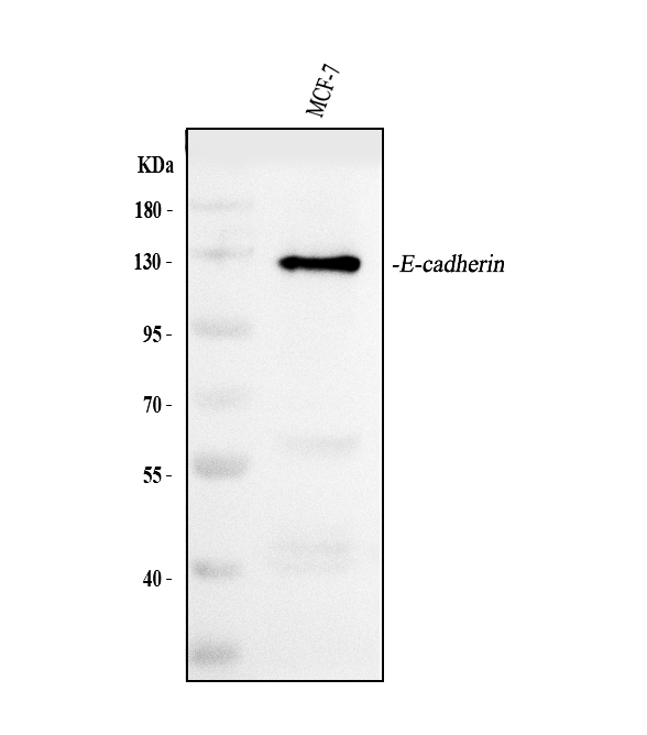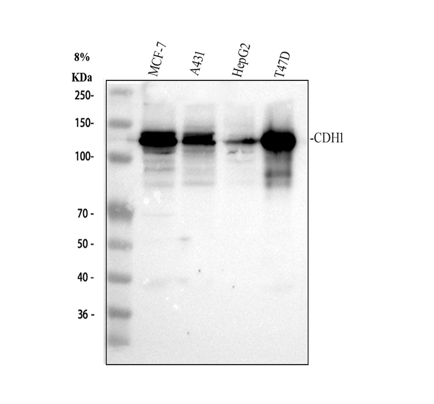 Western blot analysis of E-cadherin/CDH1 using anti-E-cadherin/CDH1 antibody (PB9561). The sample well of each lane was loaded with 30 ug of sample under reducing conditions.
