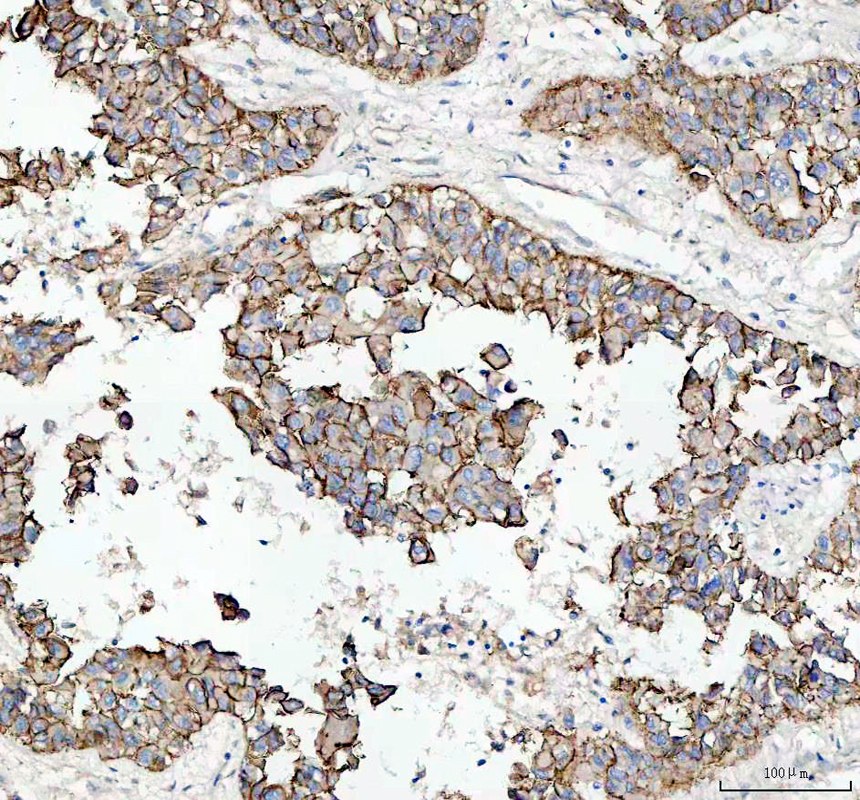 E-cadherin/CDH1 was detected in a paraffin-embedded section of human hepatocellular carcinoma tissue. The tissue section was incubated with rabbit anti-E-cadherin/CDH1 Antibody (PB9561) at a dilution of 1:200 and developed using HRP Conjugated Rabbit IgG Super Vision Assay Kit (Catalog # SV0002) with DAB (Catalog # AR1027) as the chromogen.