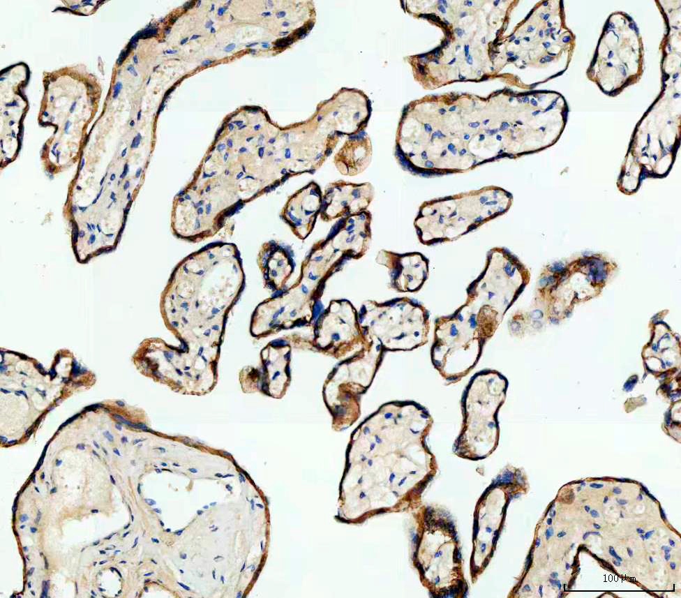 E-cadherin/CDH1 was detected in a paraffin-embedded section of human placenta tissue. The tissue section was incubated with rabbit anti-E-cadherin/CDH1 Antibody (PB9561) at a dilution of 1:200 and developed using HRP Conjugated Rabbit IgG Super Vision Assay Kit (Catalog # SV0002) with DAB (Catalog # AR1027) as the chromogen.