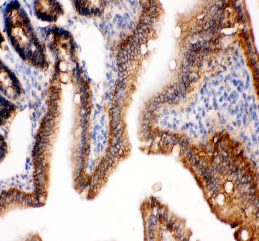 E-cadherin/CDH1 was detected in a paraffin-embedded section of mouse colon tissue. The tissue section was incubated with rabbit anti-E-cadherin/CDH1 Antibody (PB9561) at a dilution of 1:200 and developed using HRP Conjugated Rabbit IgG Super Vision Assay Kit (Catalog # SV0002) with DAB (Catalog # AR1027) as the chromogen.