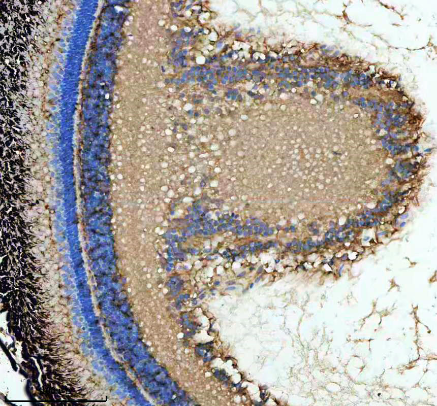 ABCE1 was detected in a paraffin-embedded section of zebrafish retina tissue. The tissue section was incubated with rabbit anti-ABCE1 Antibody (AZQ6TNW3-1) at a dilution of 1:200 and developed using HRP Conjugated Rabbit IgG Super Vision Assay Kit (Catalog # SV0002) with DAB (Catalog # AR1027) as the chromogen.