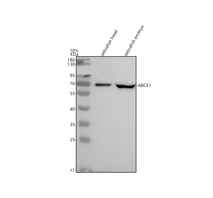 Western blot analysis of ABCE1 using anti-ABCE1 antibody (AZQ6TNW3-1). The sample well of each lane was loaded with 30 ug of sample under reducing conditions.