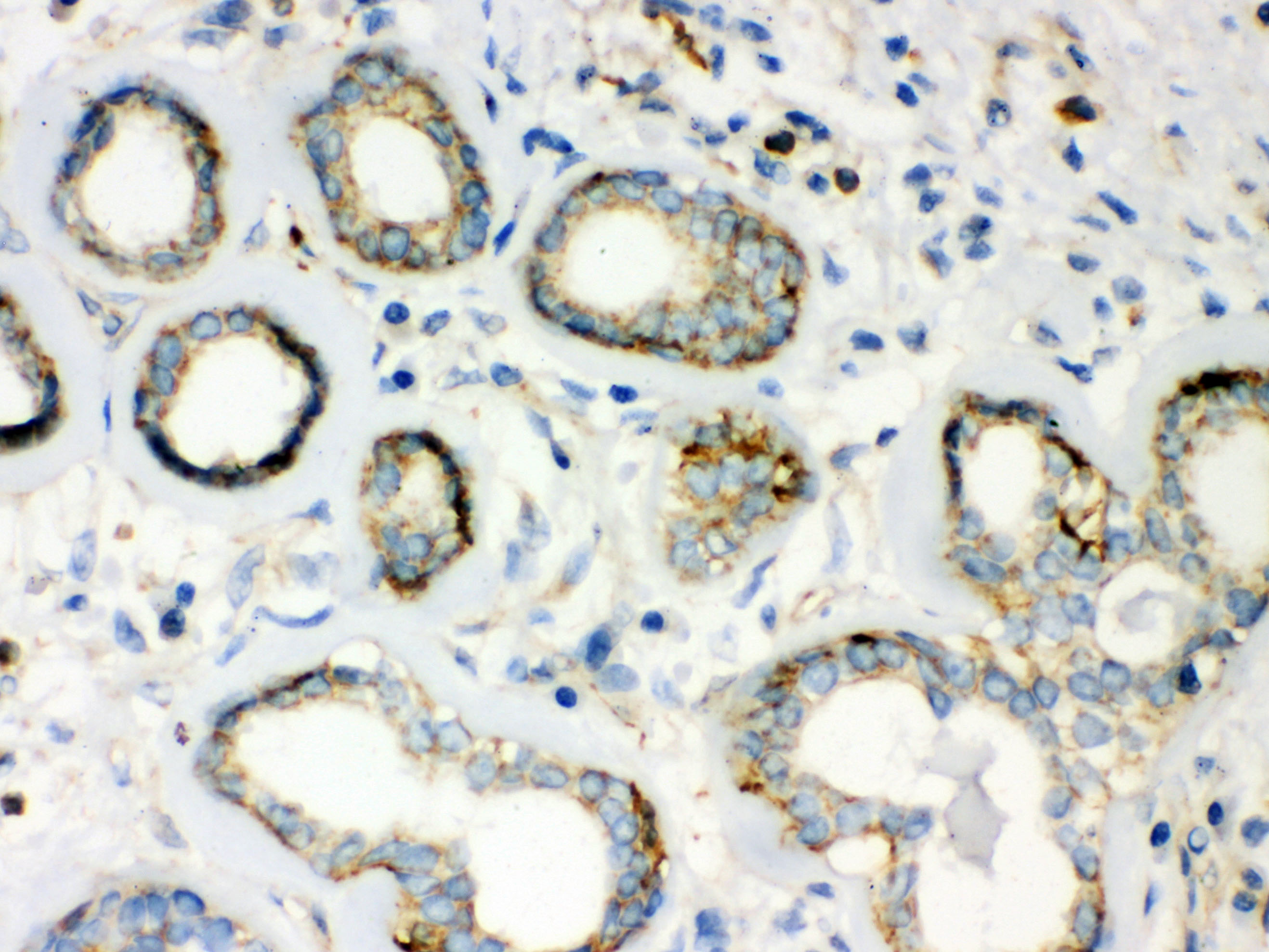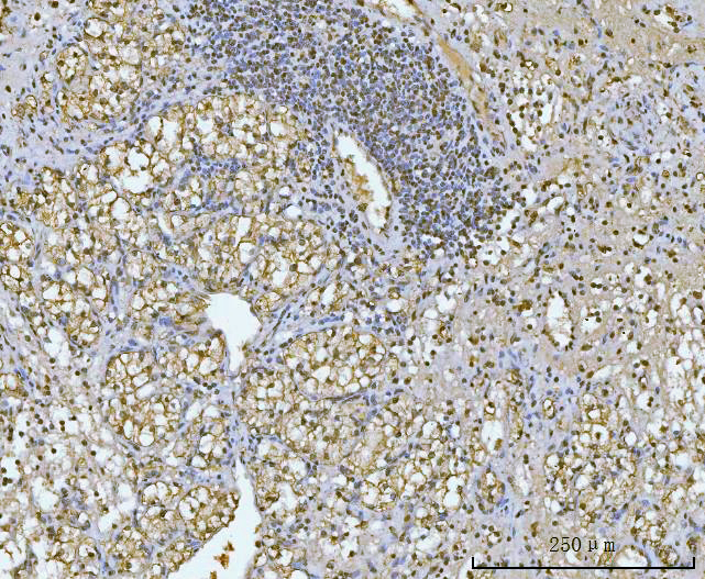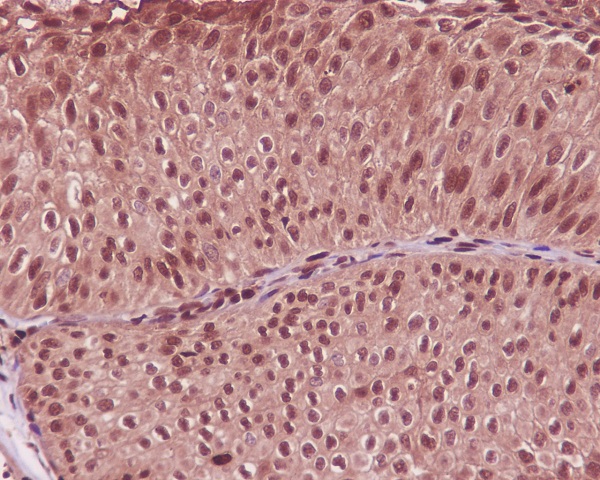 14-3-3 Epsilon/YWHAE was detected in a paraffin-embedded section of human Bladder epithelial carcinoma tissue. Biotinylated goat anti-mouse IgG was used as secondary antibody. The tissue section was incubated with mouse anti-14-3-3 Epsilon/YWHAE Antibody (M01687-2) at a dilution of 1:200 and developed using Strepavidin-Biotin-Complex (SABC) (Catalog # SA1021) with DAB (Catalog # AR1027) as the chromogen.