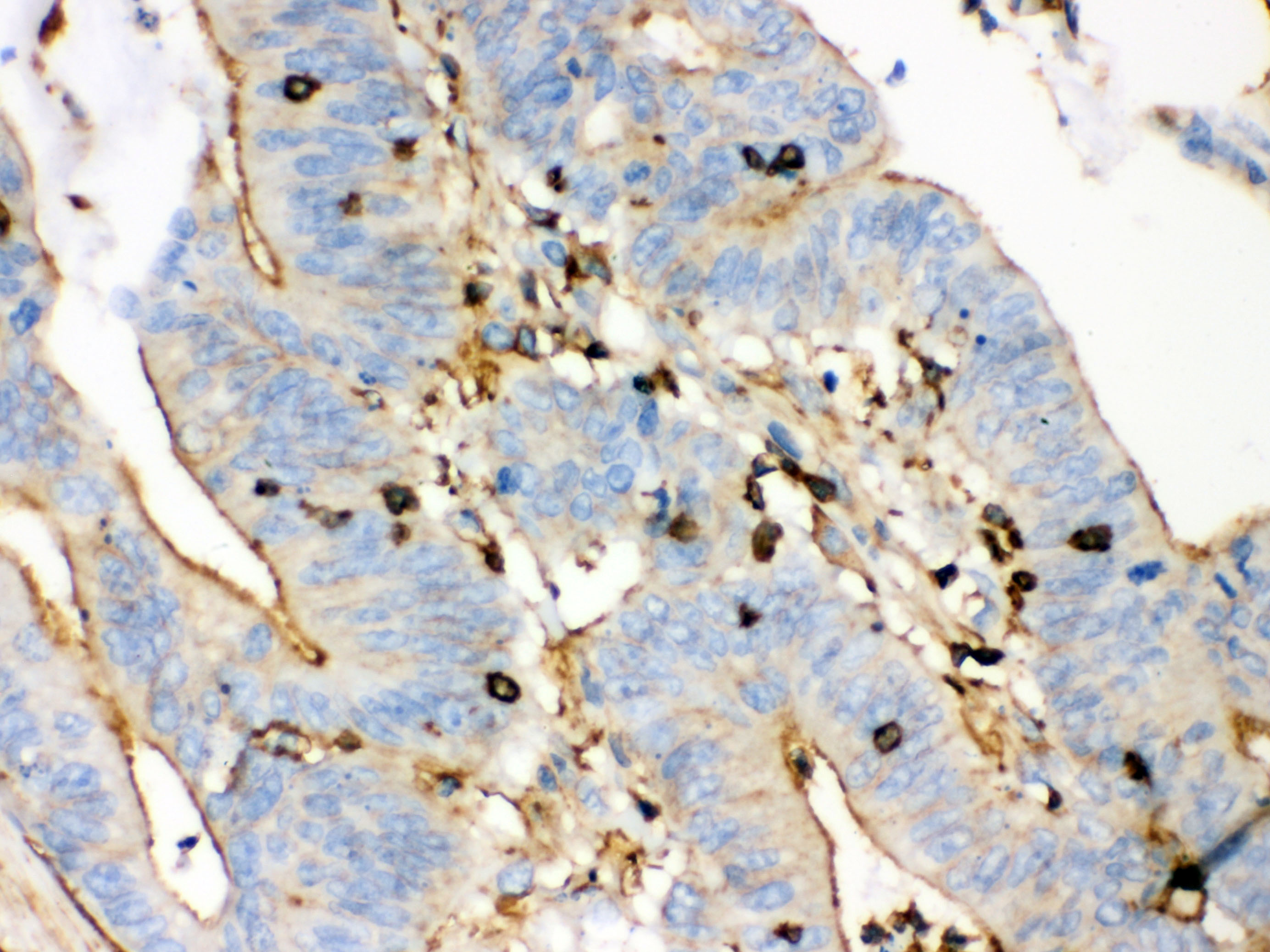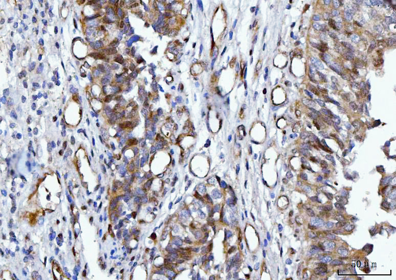 14-3-3 Epsilon/YWHAE was detected in a paraffin-embedded section of human endometrial cancer tissue. Biotinylated goat anti-mouse IgG was used as secondary antibody. The tissue section was incubated with mouse anti-14-3-3 Epsilon/YWHAE Antibody (M01687-2) at a dilution of 1:200 and developed using Strepavidin-Biotin-Complex (SABC) (Catalog # SA1021) with DAB (Catalog # AR1027) as the chromogen.